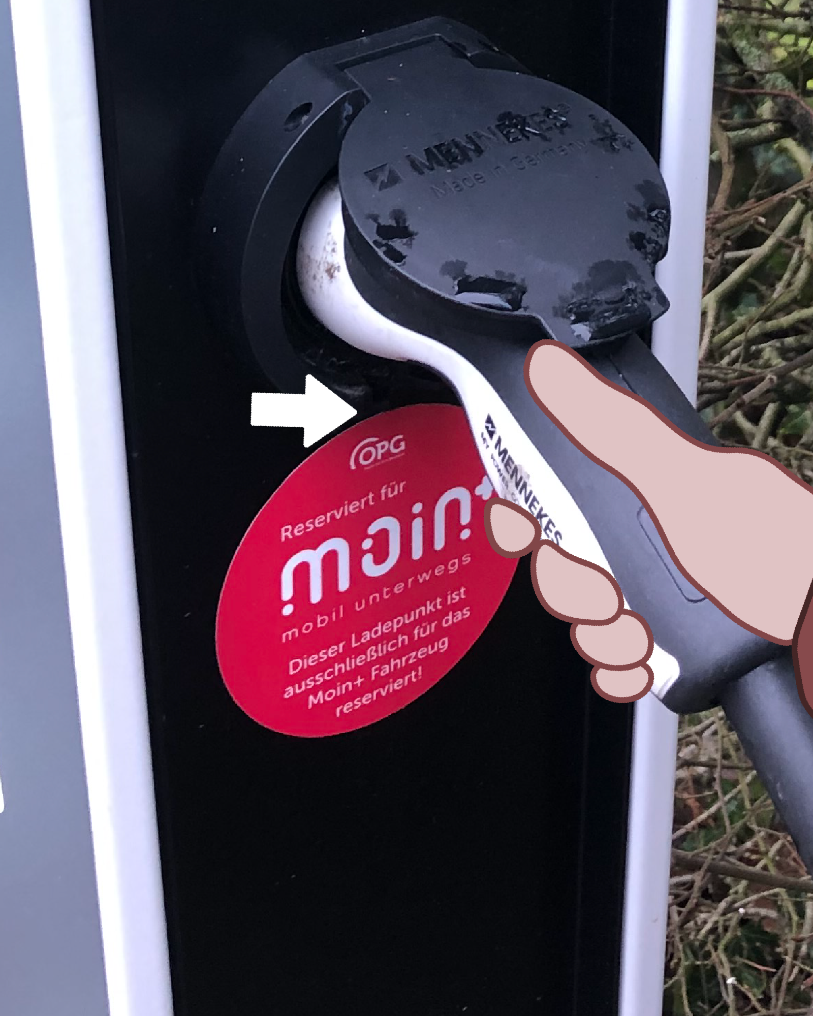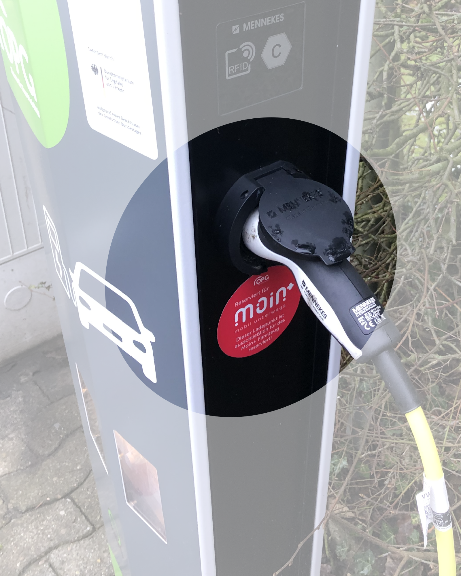 2) Verbinde das Ladekabel mit der Ladesäule auf der rechten Seite (wo sich der runde rote Moin+-Aufkleber befindet).