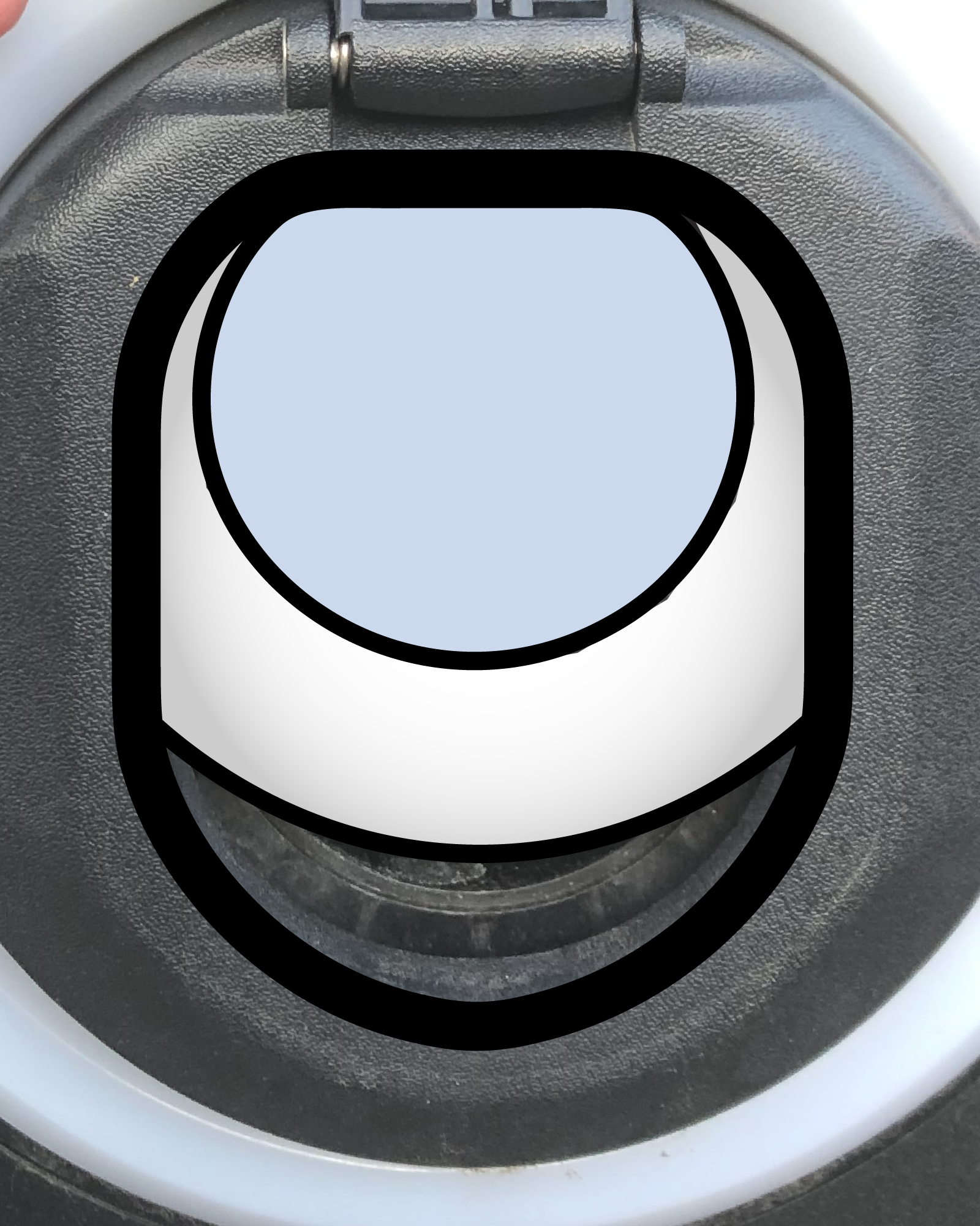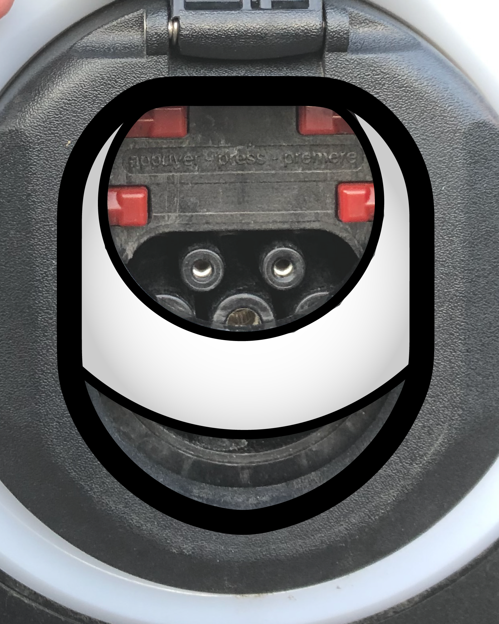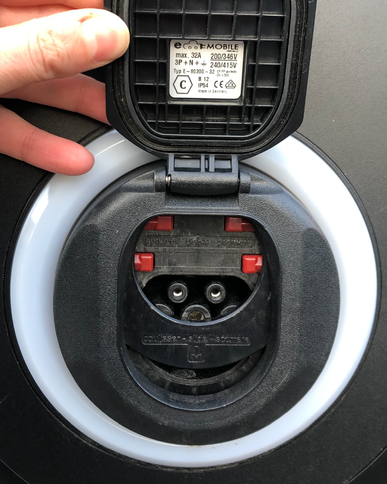 Die Ladebuchse ist hinter einem Schieber verborgen (hier zur Verdeutlichung weiß hervorgehoben).
