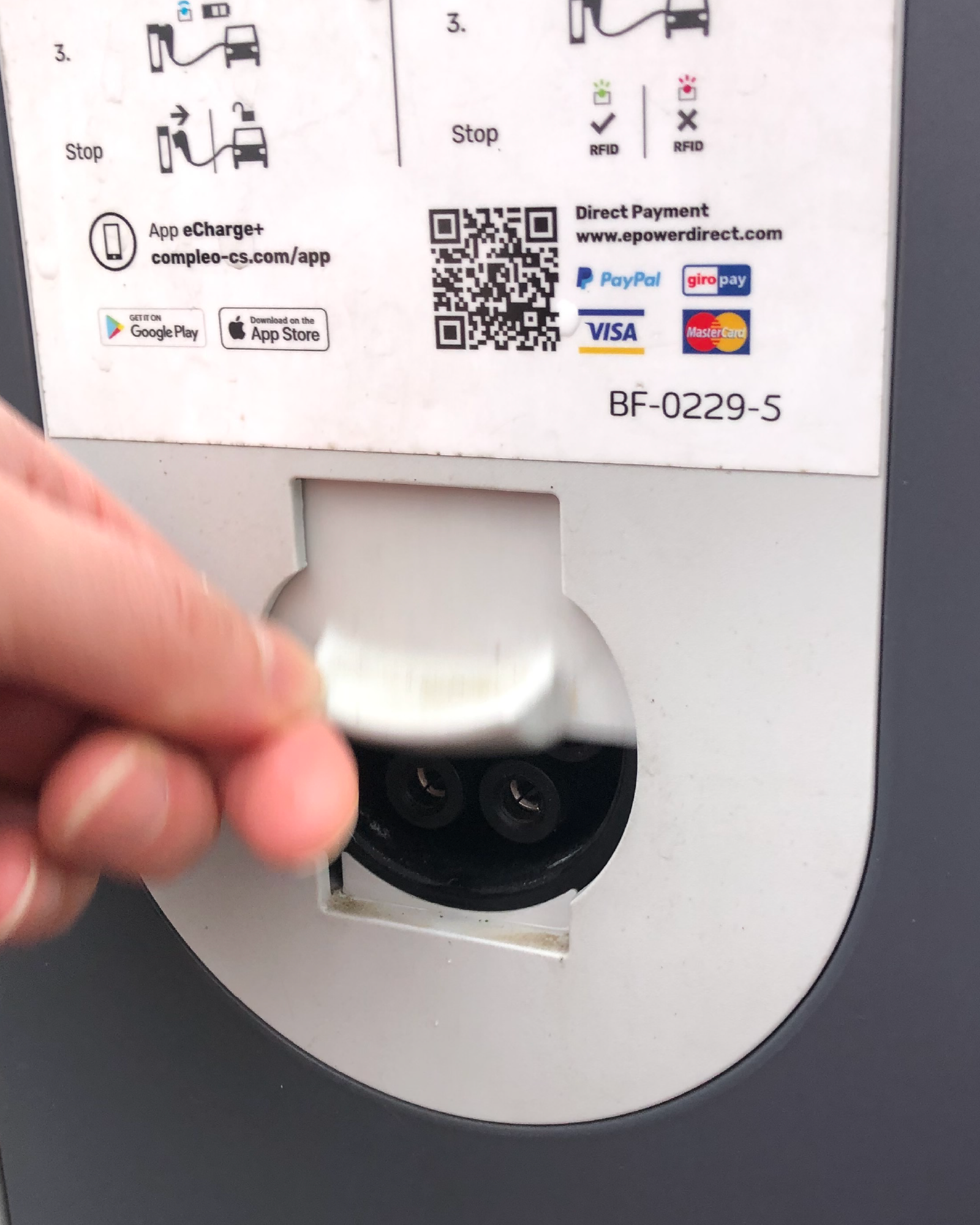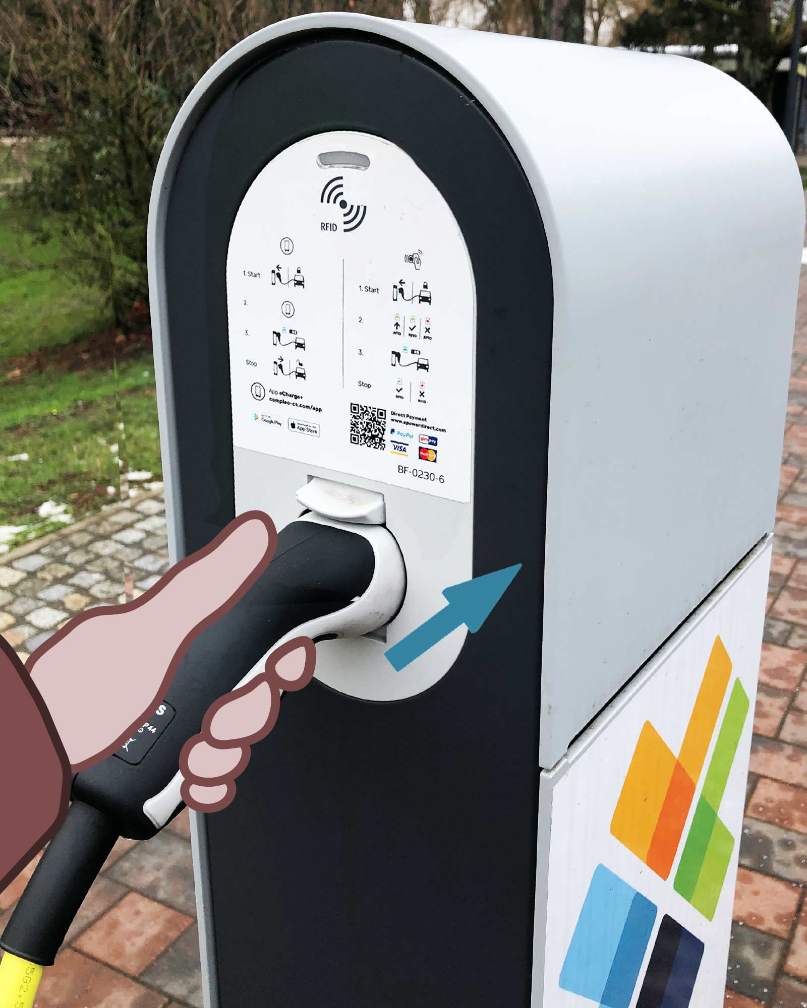 3) Führe den kleineren Stecker des Ladekabels in die Ladesäule ein.