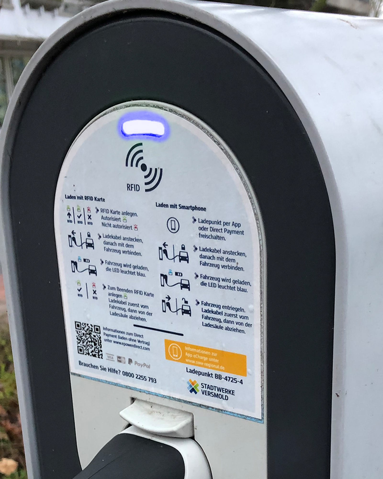 Um den Ladevorgang an dieser Säule zu starten, benötigst du die Ladekarte der Stadtwerke Versmold (weiß), die sich in der Halterung im Handschuhfach befindet.