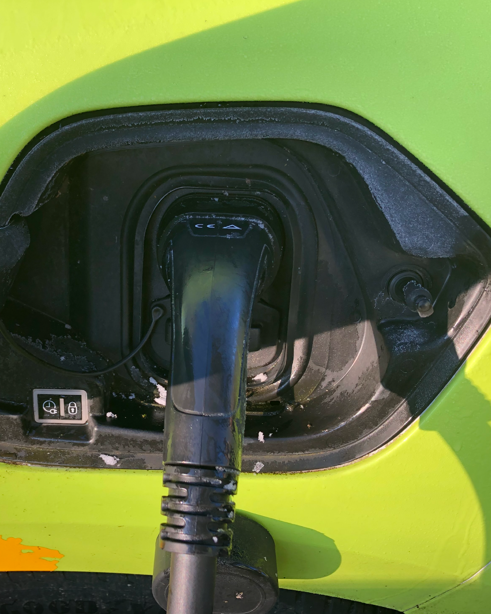 3) Wähle eine Buchse, schiebe das Schutzpanel hoch und stecke den Ladestecker ein.