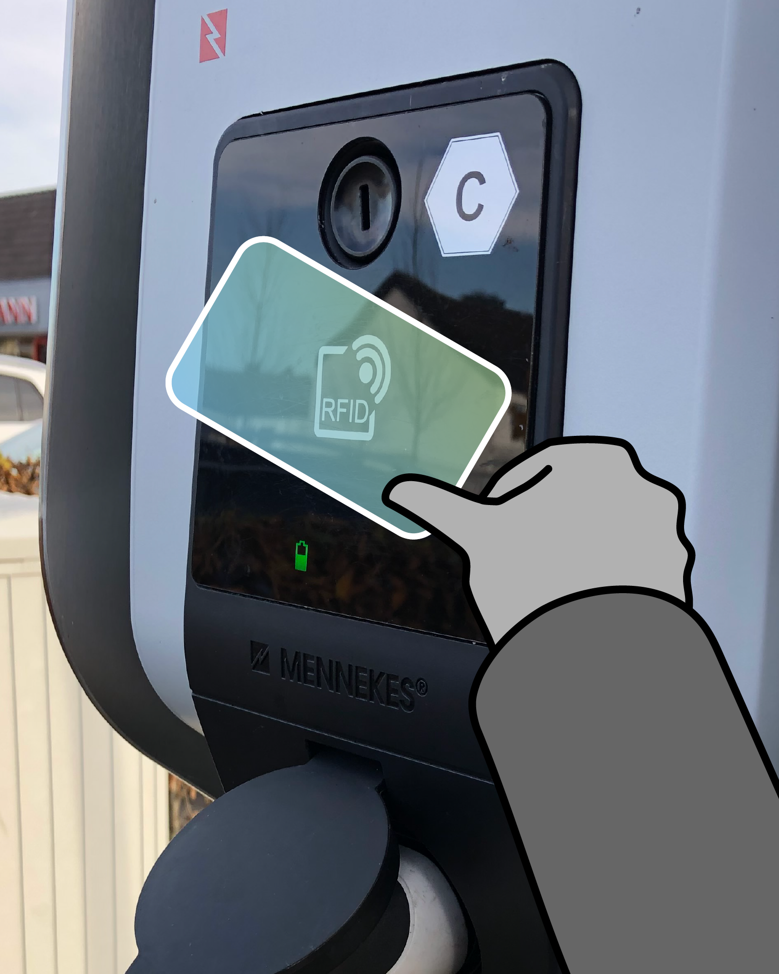 3) Halte die Ladekarte vor das RFID-Feld der Säule. Ein akustisches Signal ertönt und es leuchtet ein Batteriesymbol auf. Der Ladevorgang beginnt.